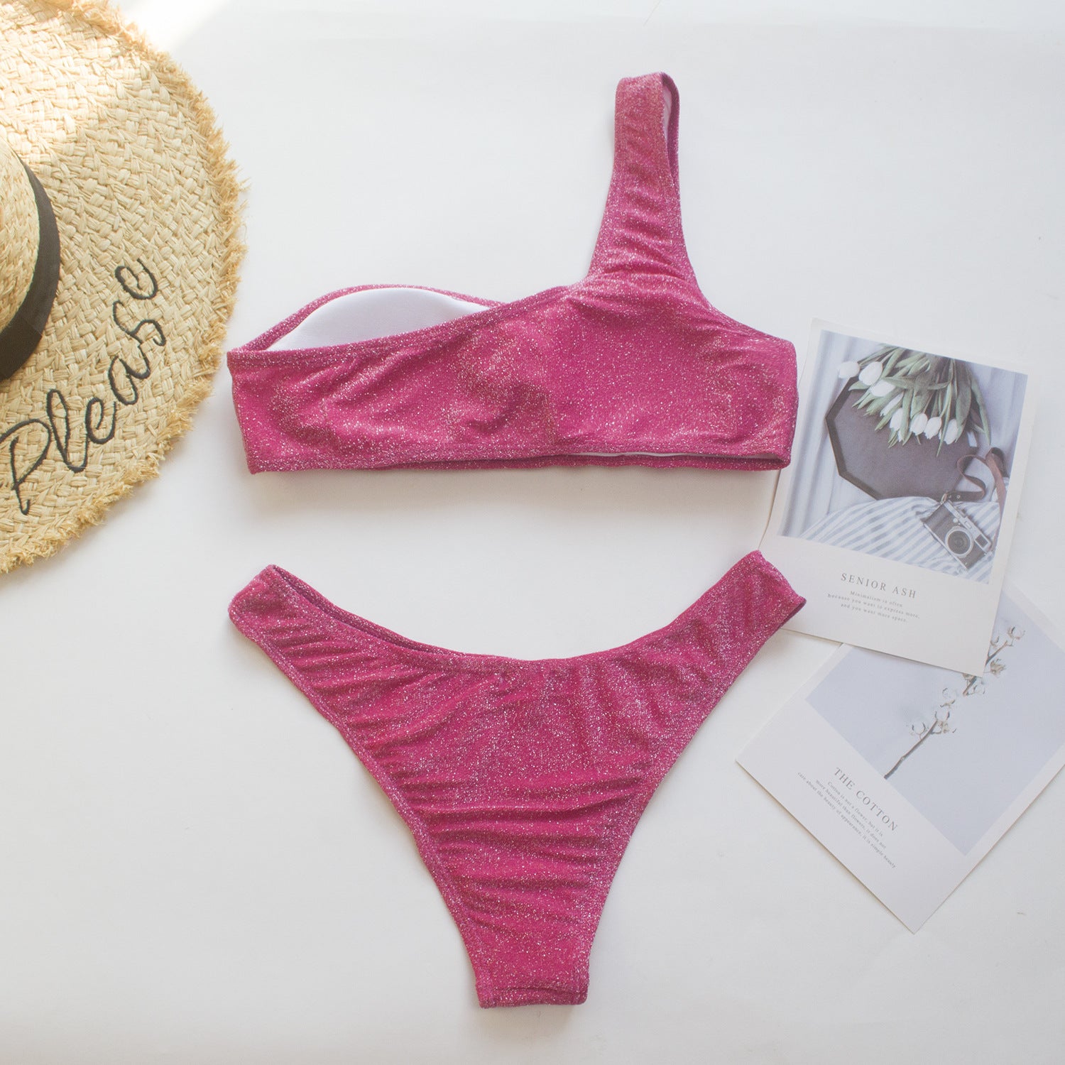 Silver Silk Swimsuit Oblique Shoulder Bikini Shiny